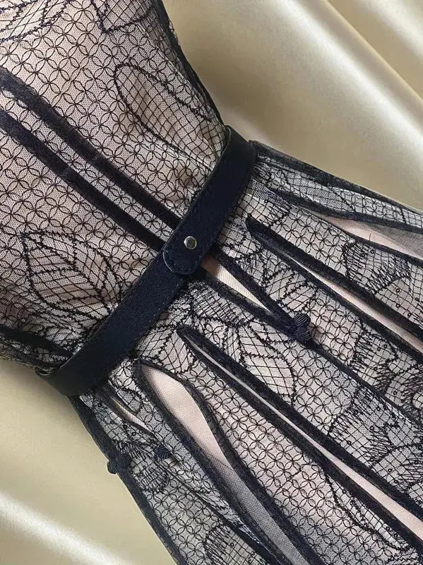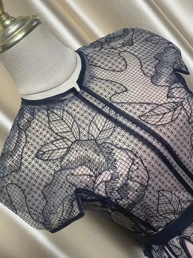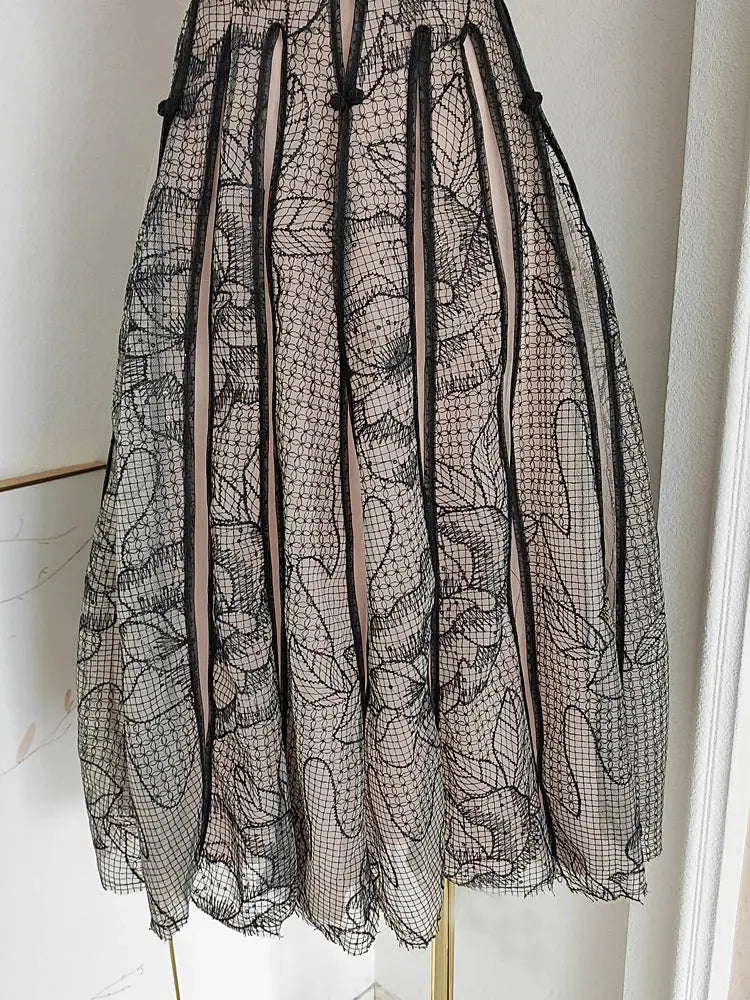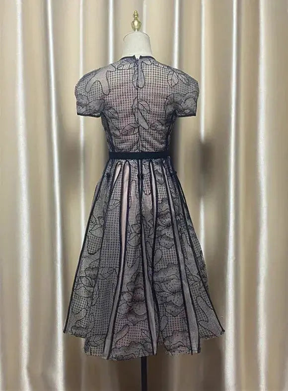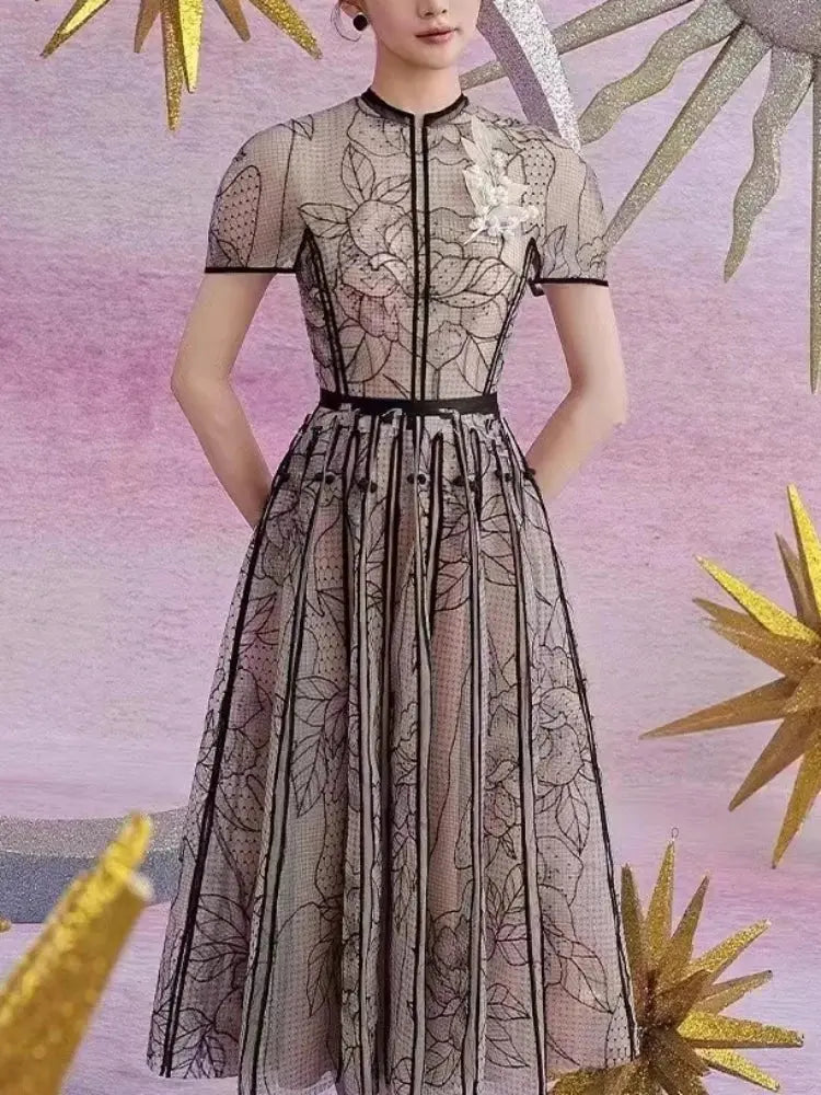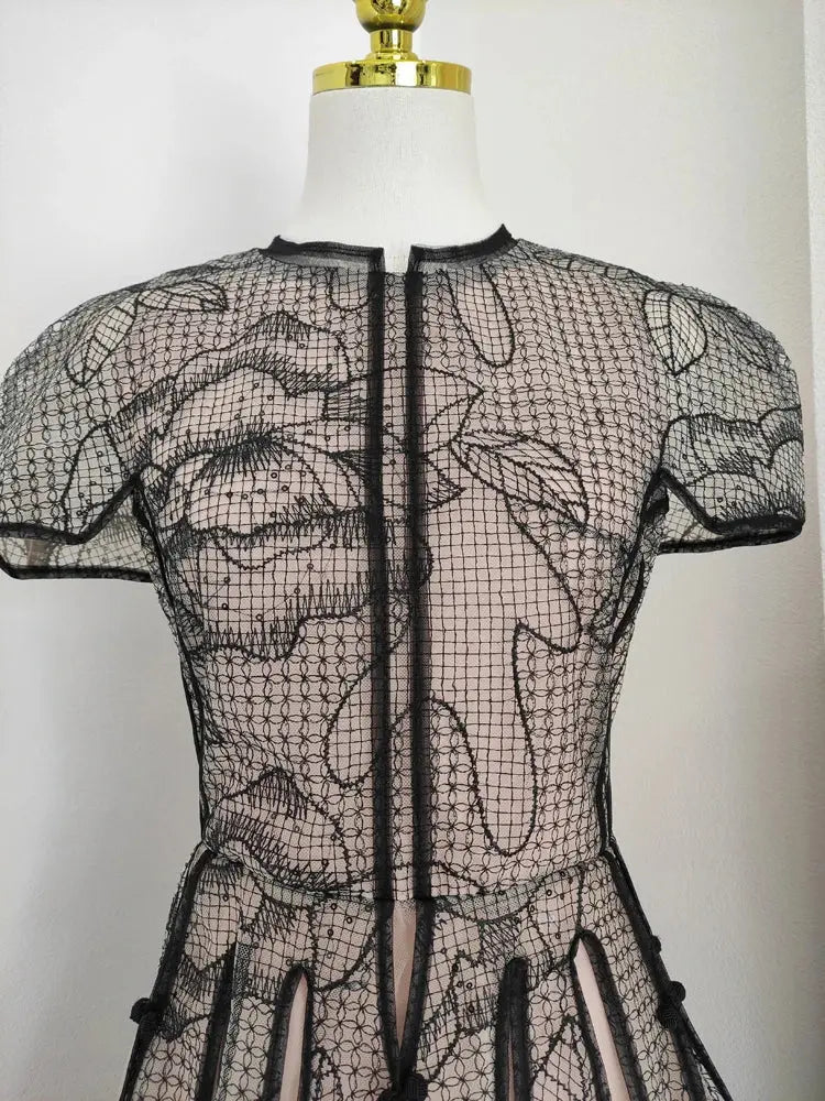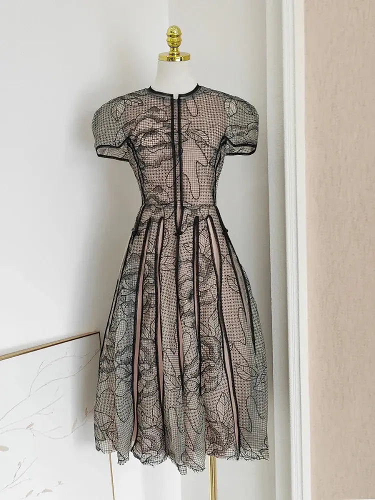 Flower embroidery adds elegance to this mesh dress with a flared silhouette. Perfect for any occasion. Bring out your inner fashionista with this stunning piece.