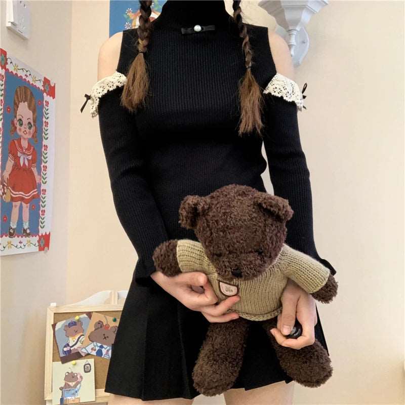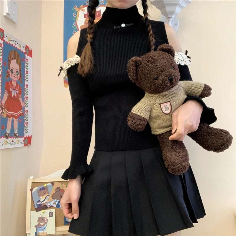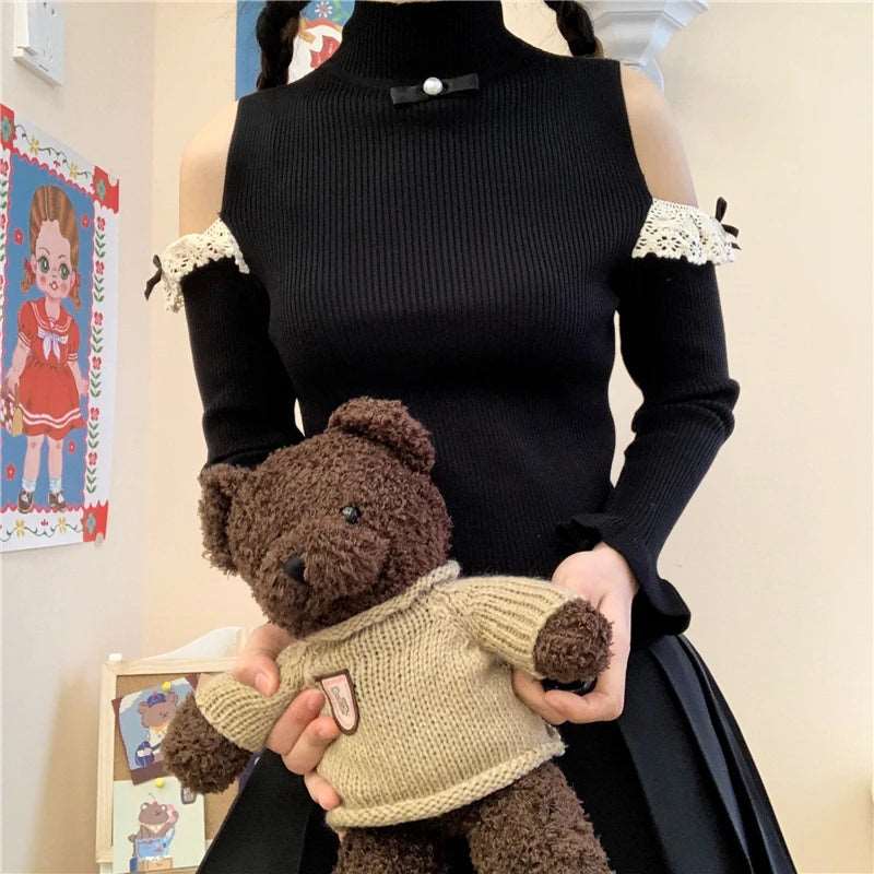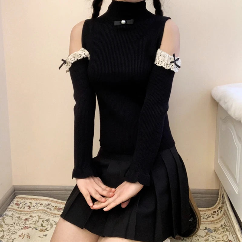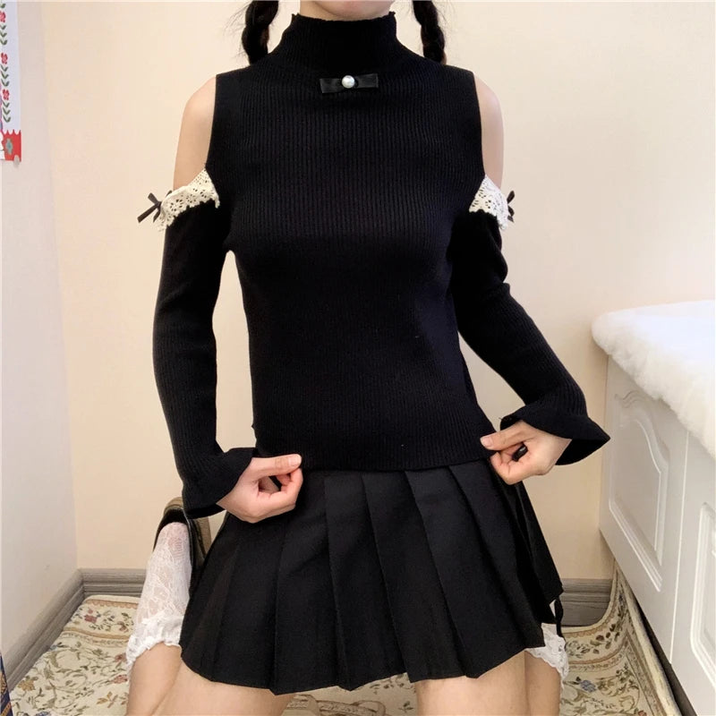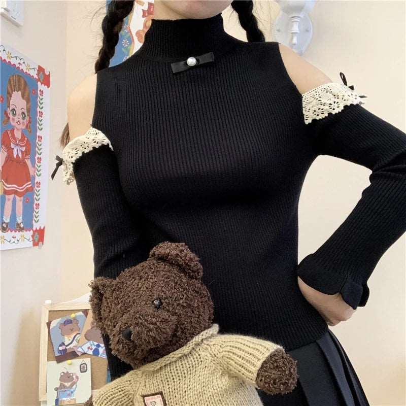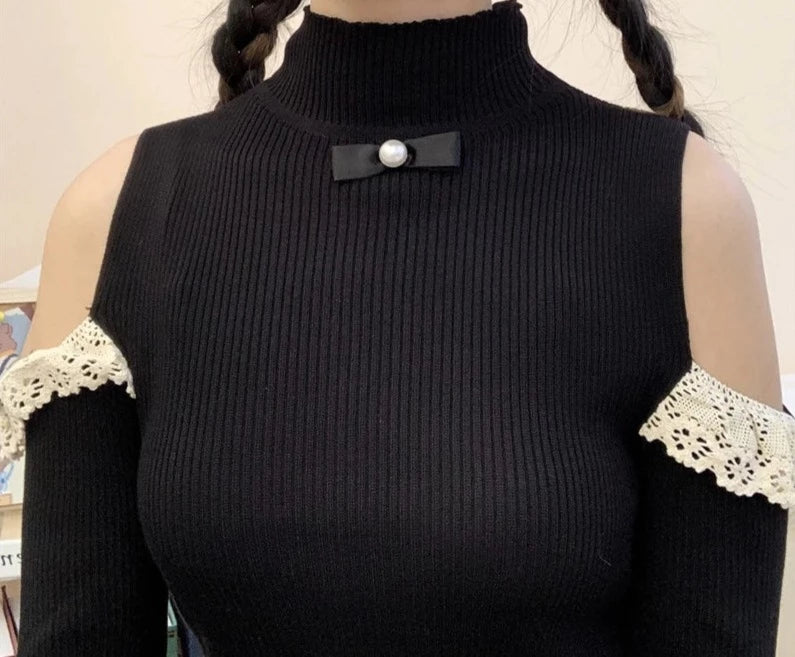 Indulge in luxury with our Beloved Lace Open Shoulder Sweater. The sophisticated lace design exudes charm and delight, while the open shoulder adds an alluring touch. The dainty detachable bow with pearl along the mock top neckline elevates this sweater to the height of elegance. Perfect for any occasion, this sweater is a must-have for the fashion-forward individual.