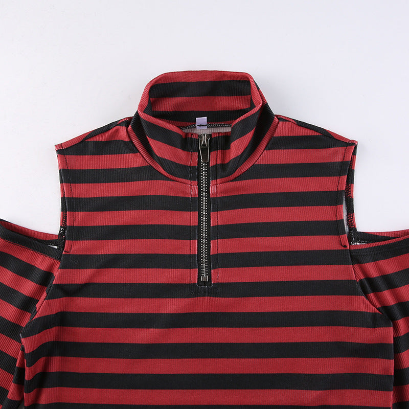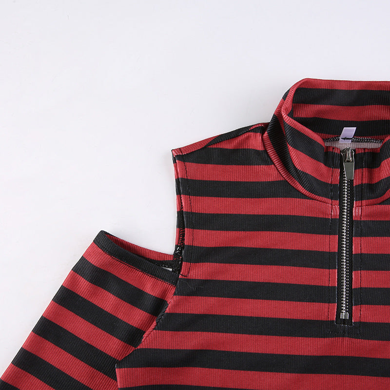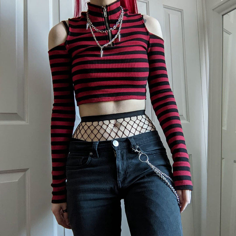 Try not to give them the cold shoulder in this Grunge Striped Open Shoulder Long Sleeve Crop Top!