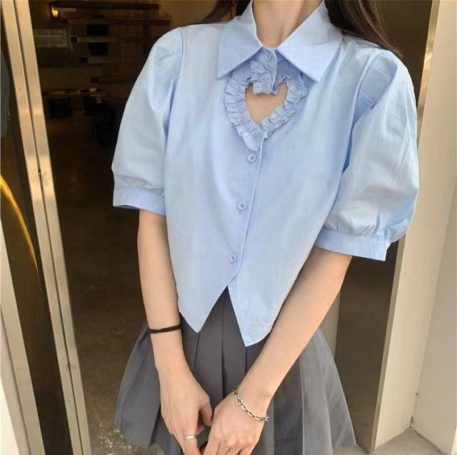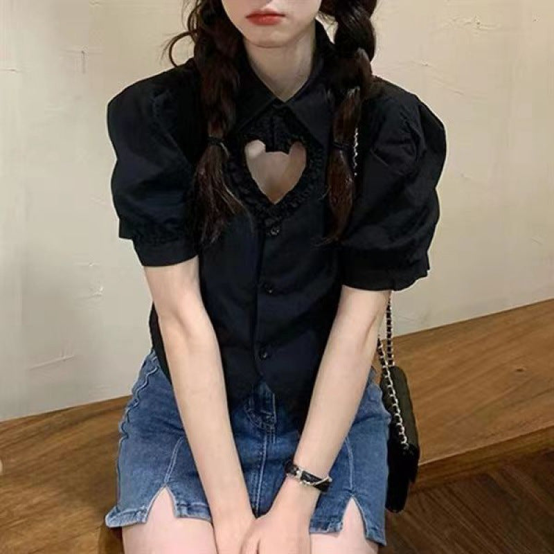 Elevate your style with our Kawaii Hollow Heart Pointed Shirt. This exclusive piece features a heart cutout in the middle, puff sleeves and a pointed hem, adding a touch of romance to your look. With a button-up design, this shirt is both cute and unique, making it a must-have for any fashion-forward wardrobe.