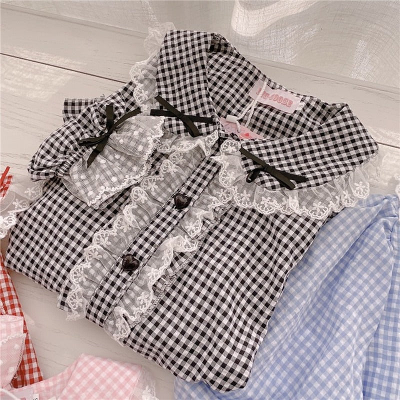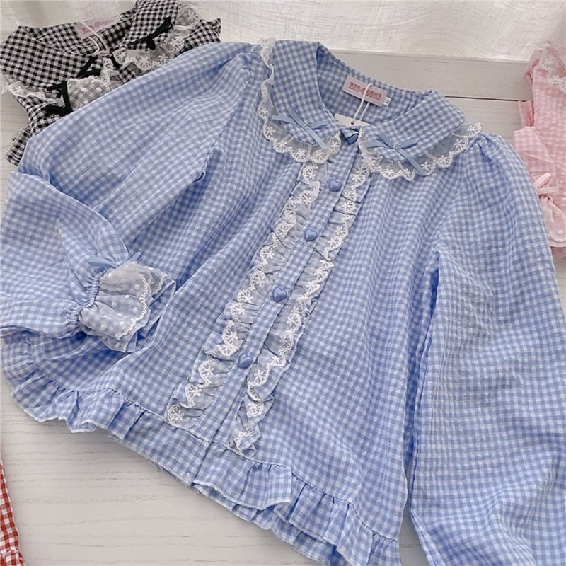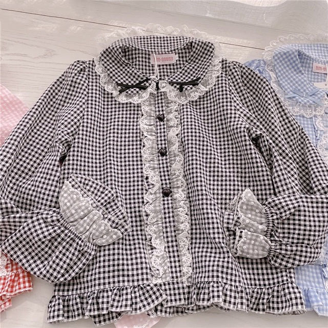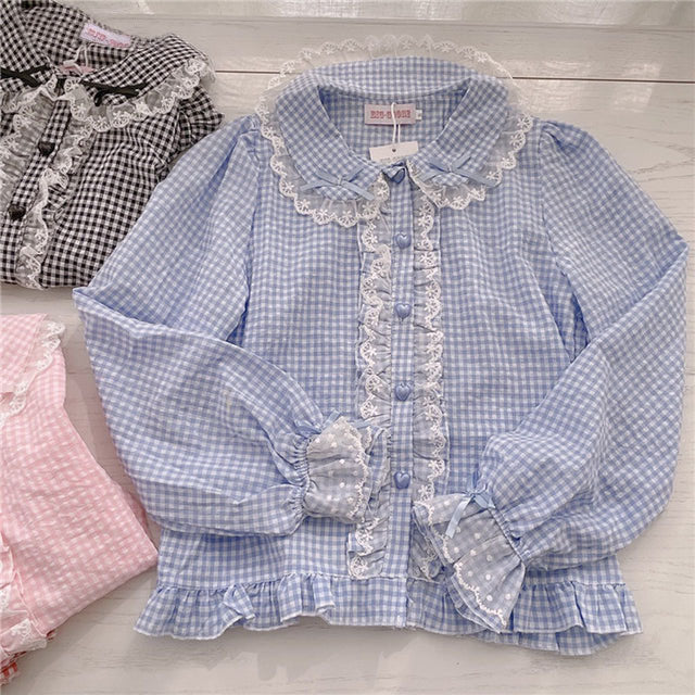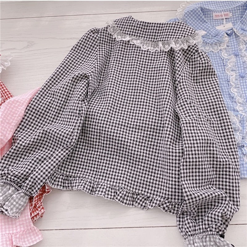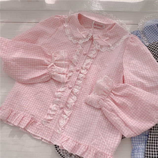 You'll be all kinds of cute in this Kawaii Lace Ruffles Bow Collar Gingham Long Sleeve Blouse!