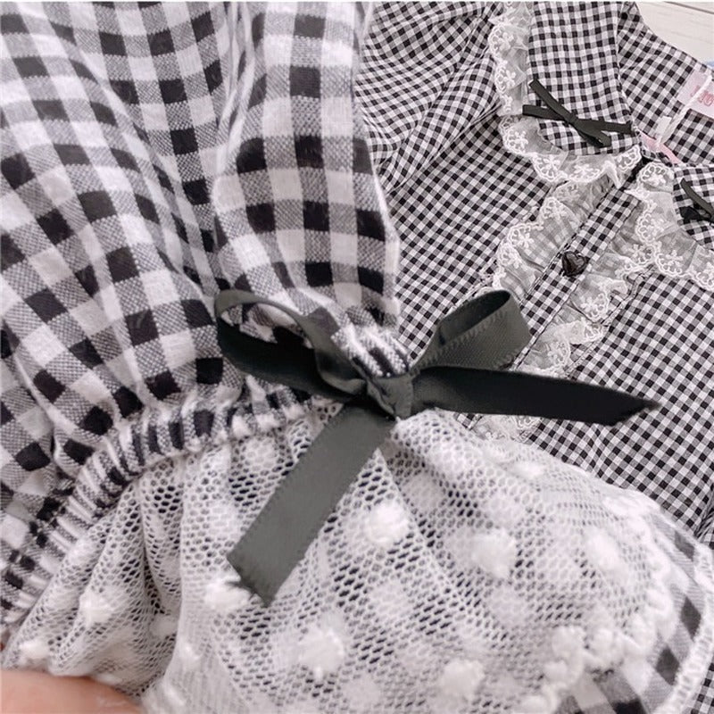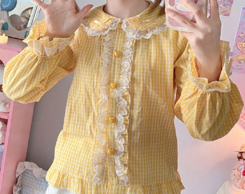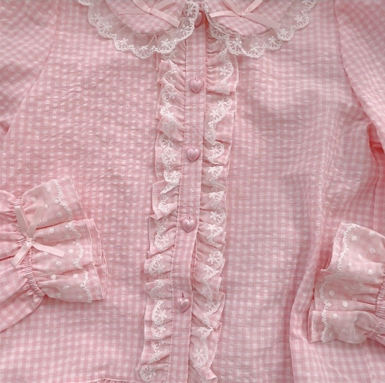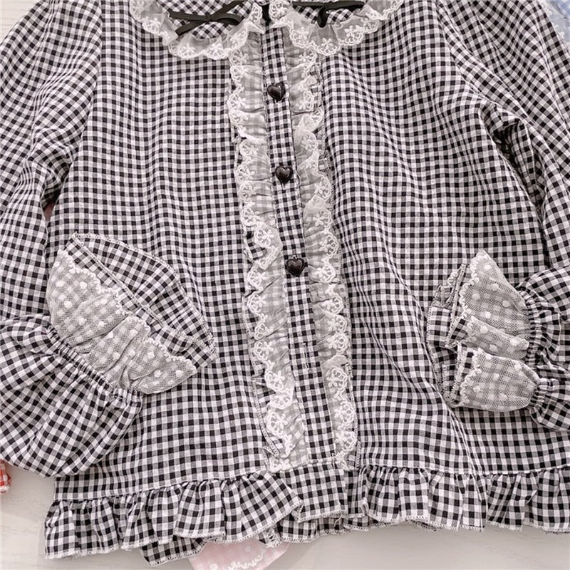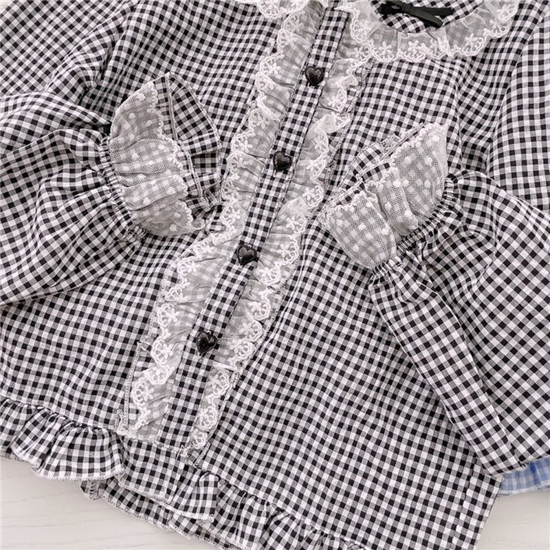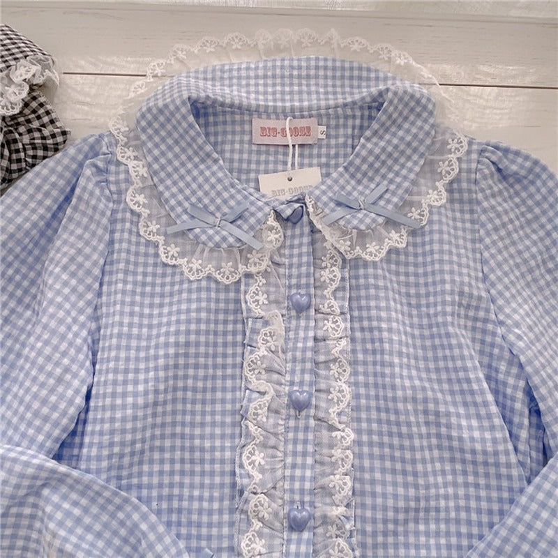 You'll be all kinds of cute in this Kawaii Lace Ruffles Bow Collar Gingham Long Sleeve Blouse!