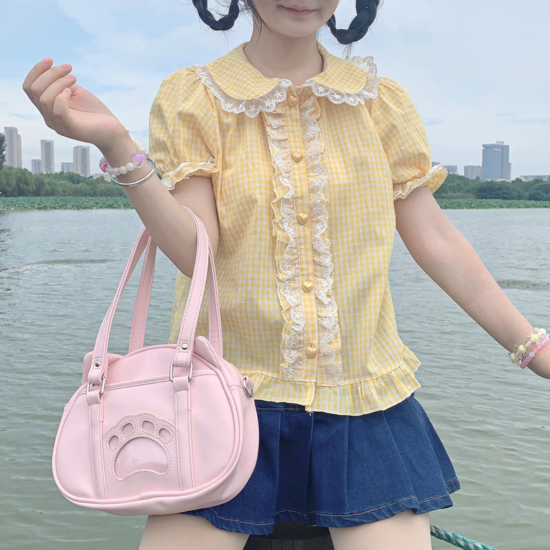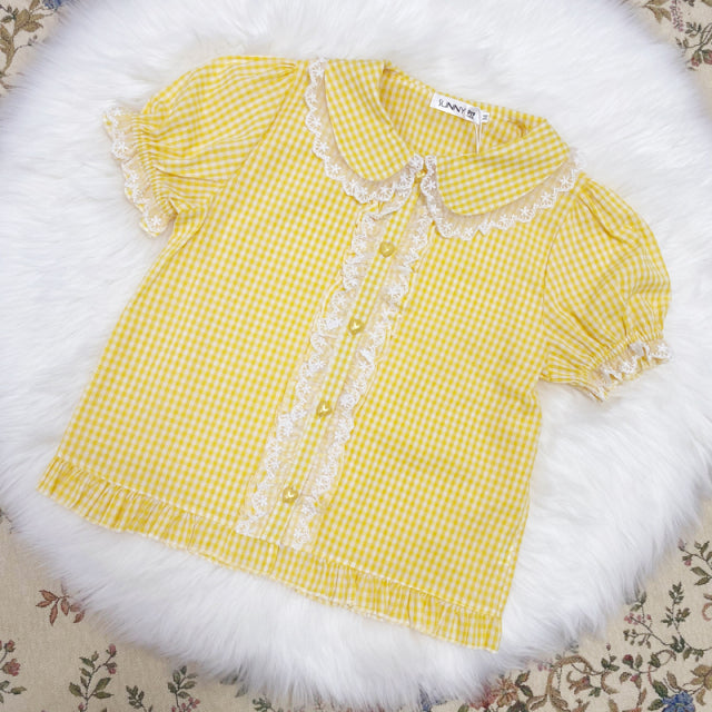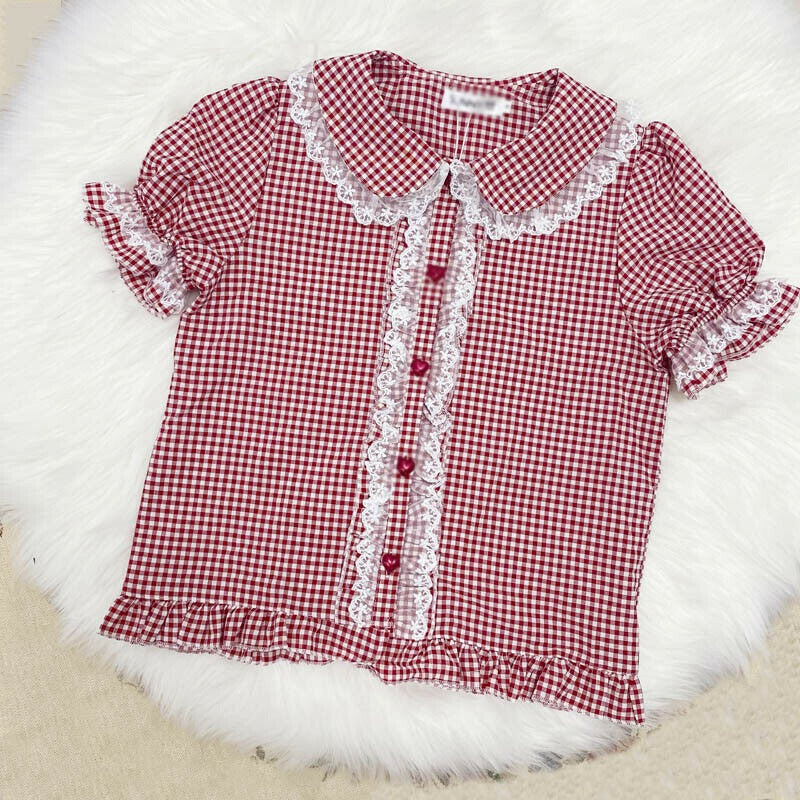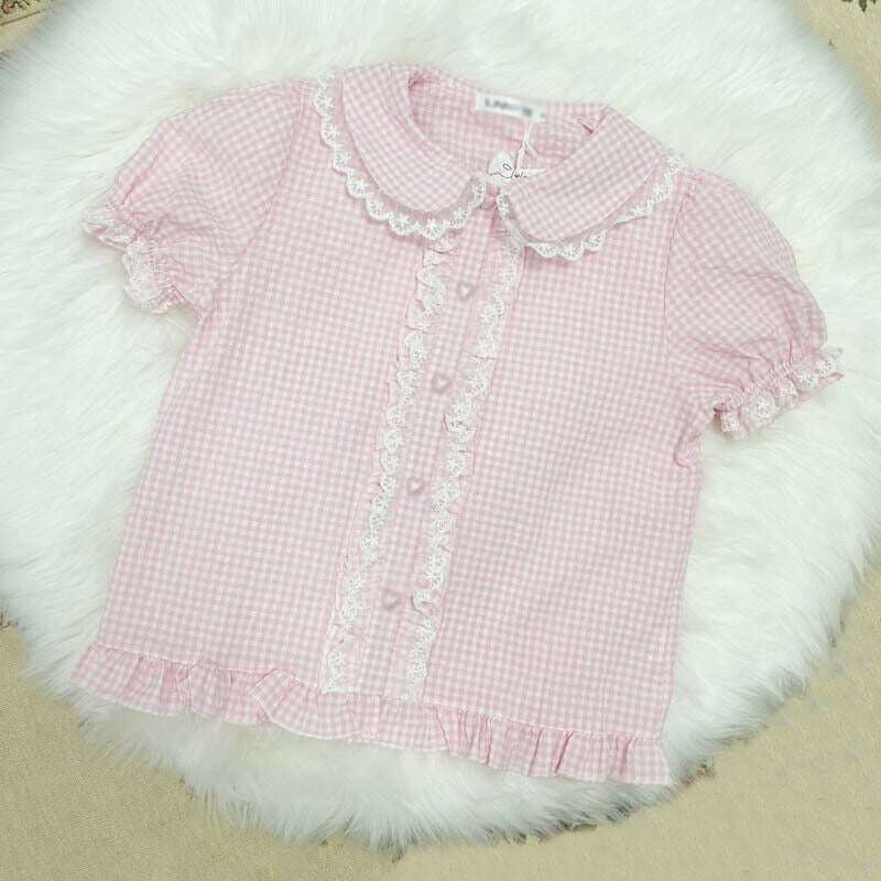 You'll look cute as a button in this Kawaii Lace Ruffles Gingham Short Sleeve Blouse!