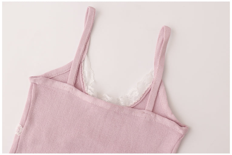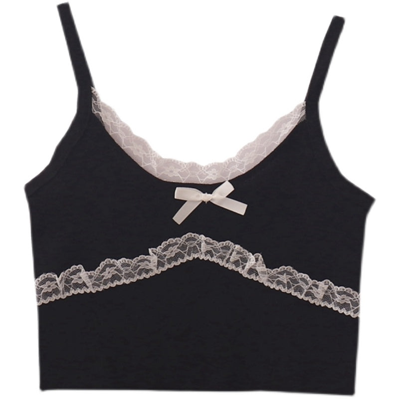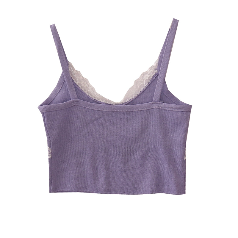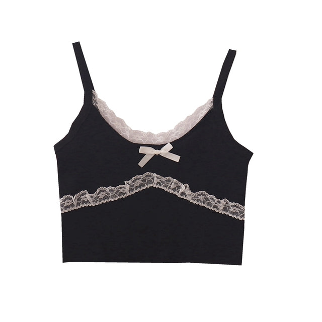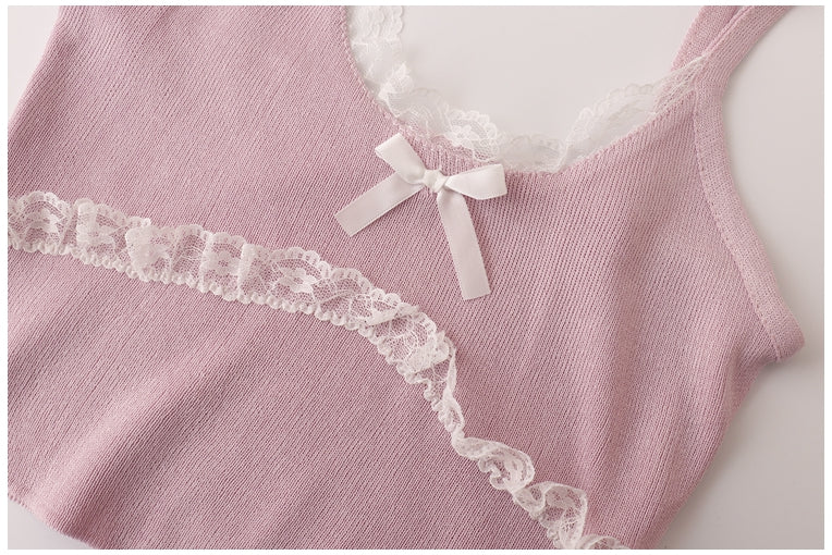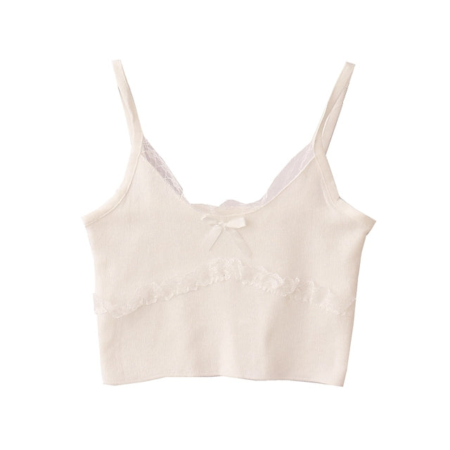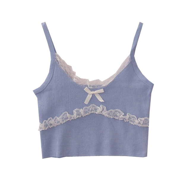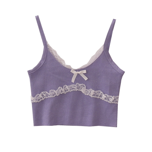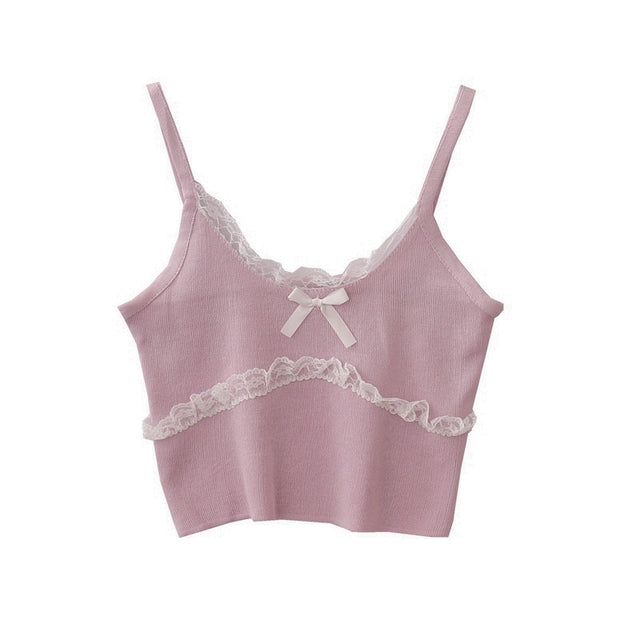 This Lace Trim Cami Crop Top adds a touch of dainty charm to any outfit. Its ribbed, knitted design is both cute and adorable. With delicate lace trim and a cute bow, this top is perfect for adding a touch of femininity to your look. Embrace your cute and confident side with this lovely crop top!