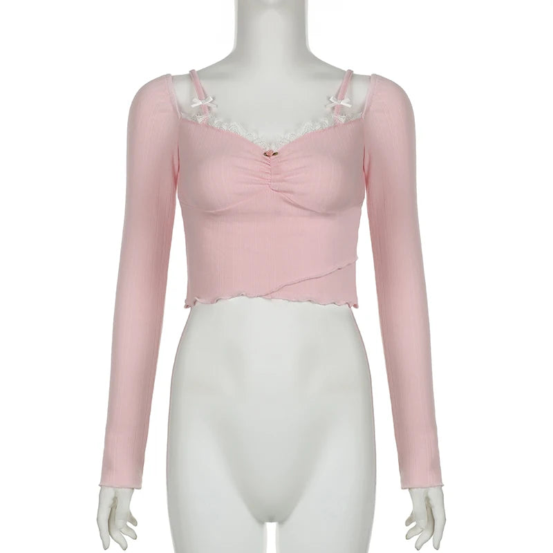 Sweeten up your wardrobe with our Sweet Coquette Lace Trim Top! This crop top features dual sleeves (spaghetti strap and long sleeve!) and delicate lace trim, adding a touch of romance to any outfit. In a flirty pink hue with a rose accent, it's the perfect shirt to complete any coquette mood board.