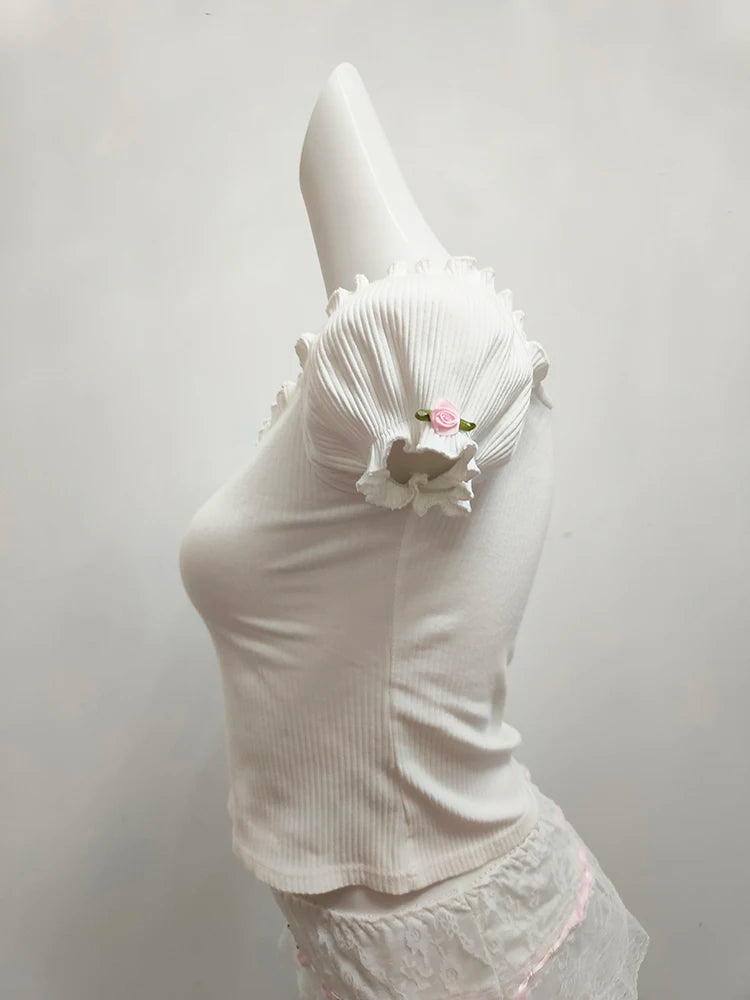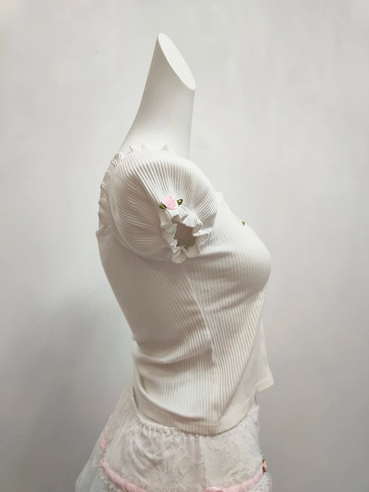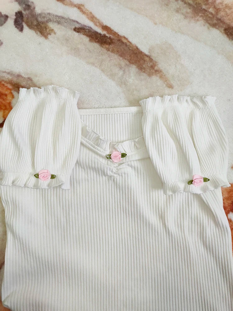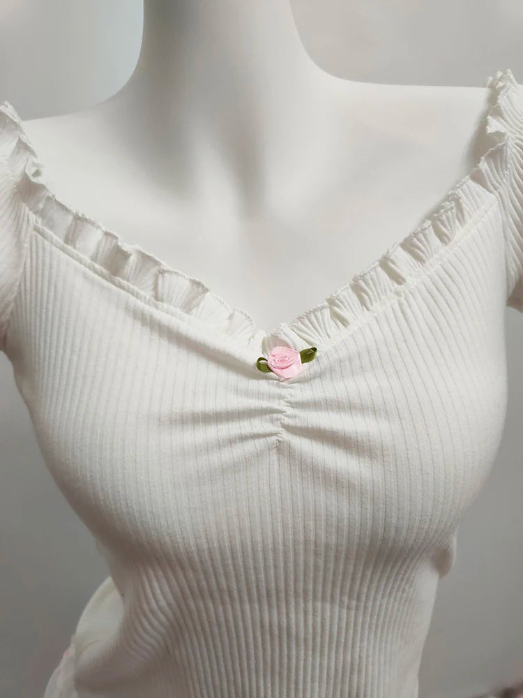 Get ready to turn heads with our Sweet Flower Short Sleeve V-Neck Shirt! The V-neck and ribbed design add a touch of elegance, while the ruffle edges and cute floral details add a playful and sweet touch. The slightly off-shoulder fit is perfect for a fun and flirty look. Adorable and stylish, this shirt is a must-have!